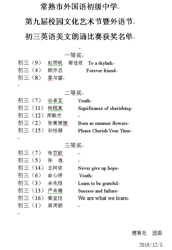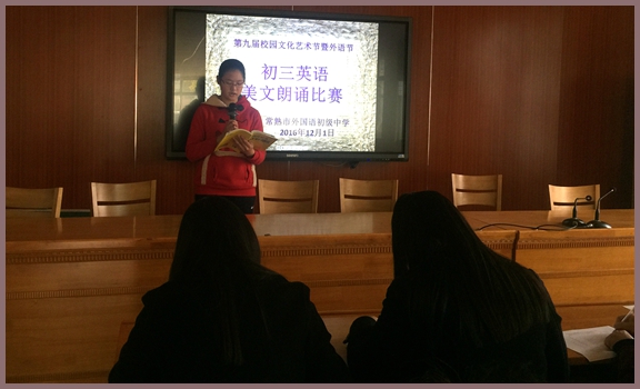 12月1日中午英语美文朗诵比赛在学校综合楼会议室举行,参加本次比赛的是初三年级,他们为大家带来了一次英语美文欣赏的盛宴。