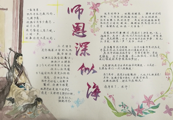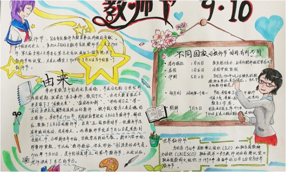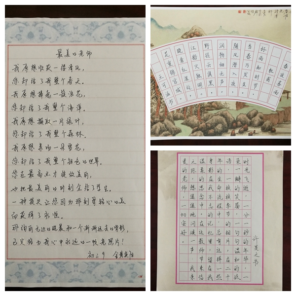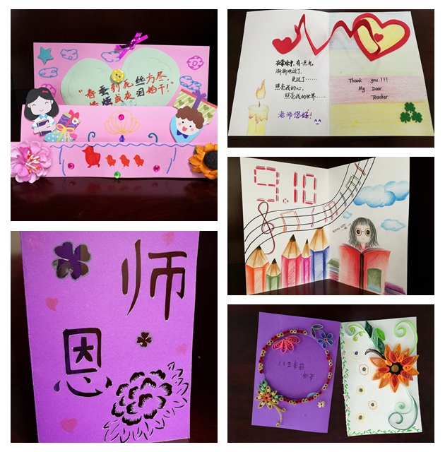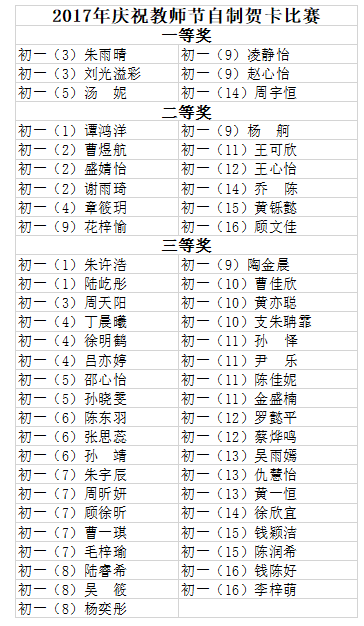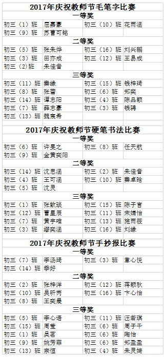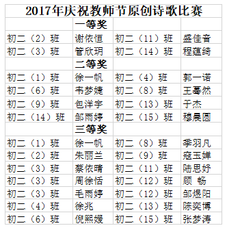 我校庆祝第三十三个教师节系列活动学生获奖情况 来源:本站原创 发布时间:2017-09-15 16:25:49 浏览次数: 次 【字体:小 大】 2017年9月10日,恰逢第三十三个教师节,我校学生用多种形式表达了对老师的赞美和感恩之情。初一同学自制的教师节贺卡既漂亮又有创意,初二同学用原创诗歌歌颂和赞美老师,初三同学则用各种书画作品来表达对老师深深的祝福。学校组织老师对学生的作品进行了认真的评选,获奖情况如下: 分享到: 【打印正文】